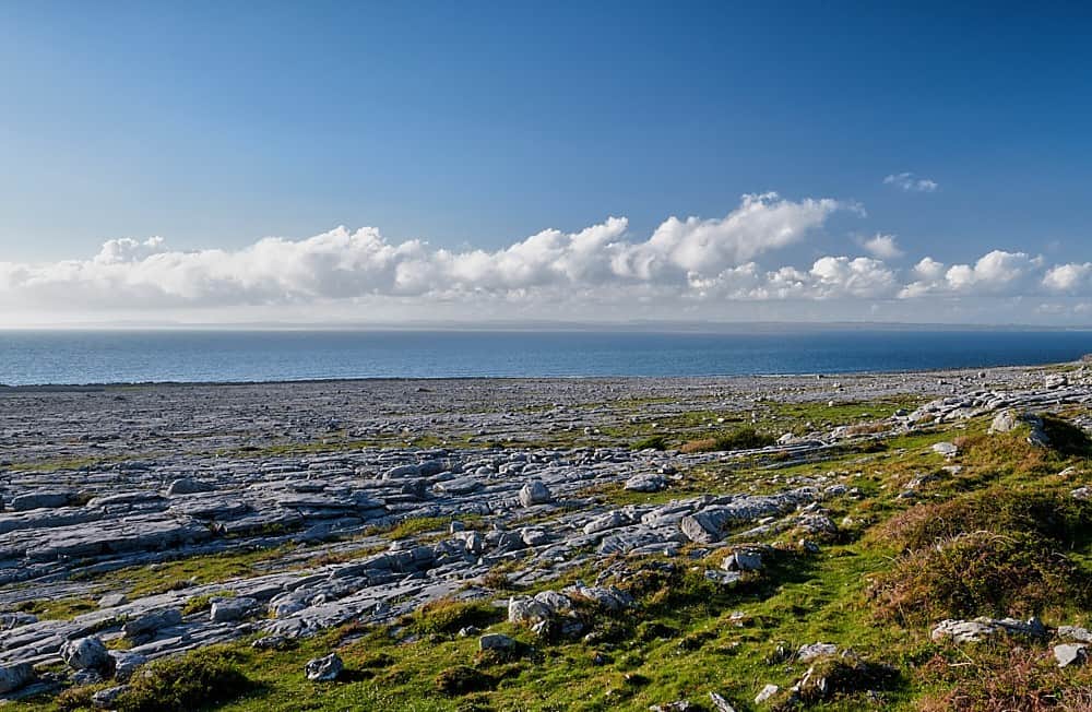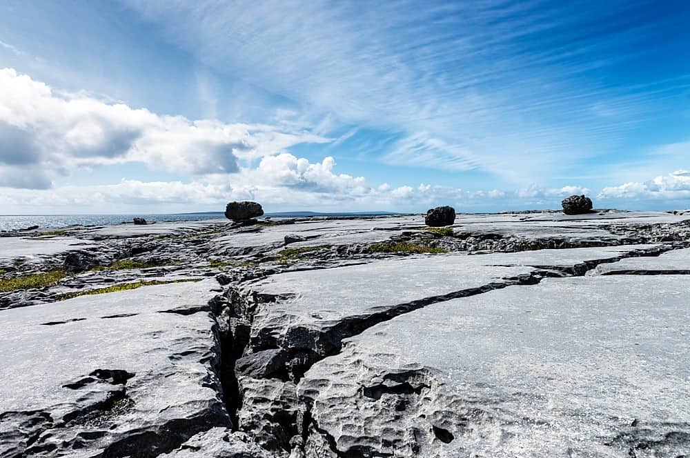 Ebenso bizarr wie die felsigen Hügel im Landesinneren ist die Kalksteinküste des Burren. Große Steinplatten dominieren das Landschaftsbild. Diese sind unterbrochen von einem Labyrinth aus Spalten und Ritzen, in denen eine unglaubliche Vielfalt an Pflanzen gedeiht.