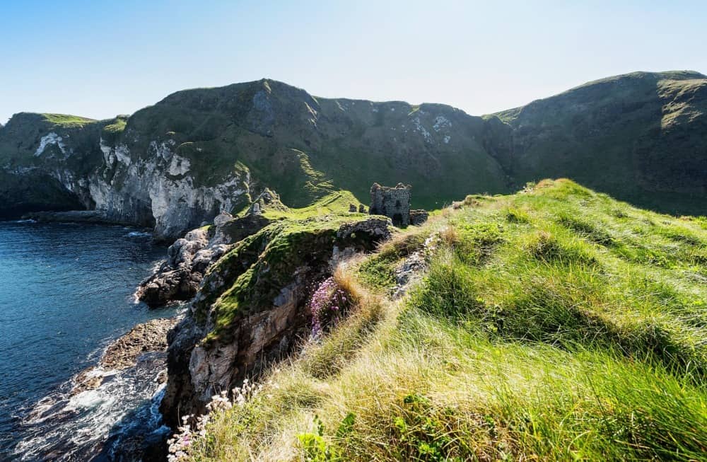 Kinbane Castle, teils auch Kenbane Castle geschrieben, thront malerisch auf einer Landzunge aus weißem Kalkstein im Rathlin Sound. Um 1540 wurde die Festung von dem über die Region herrschenden McDonell Clan erbaut und später den MacAllisters aus Dank für deren loyale Dienste übertragen.
