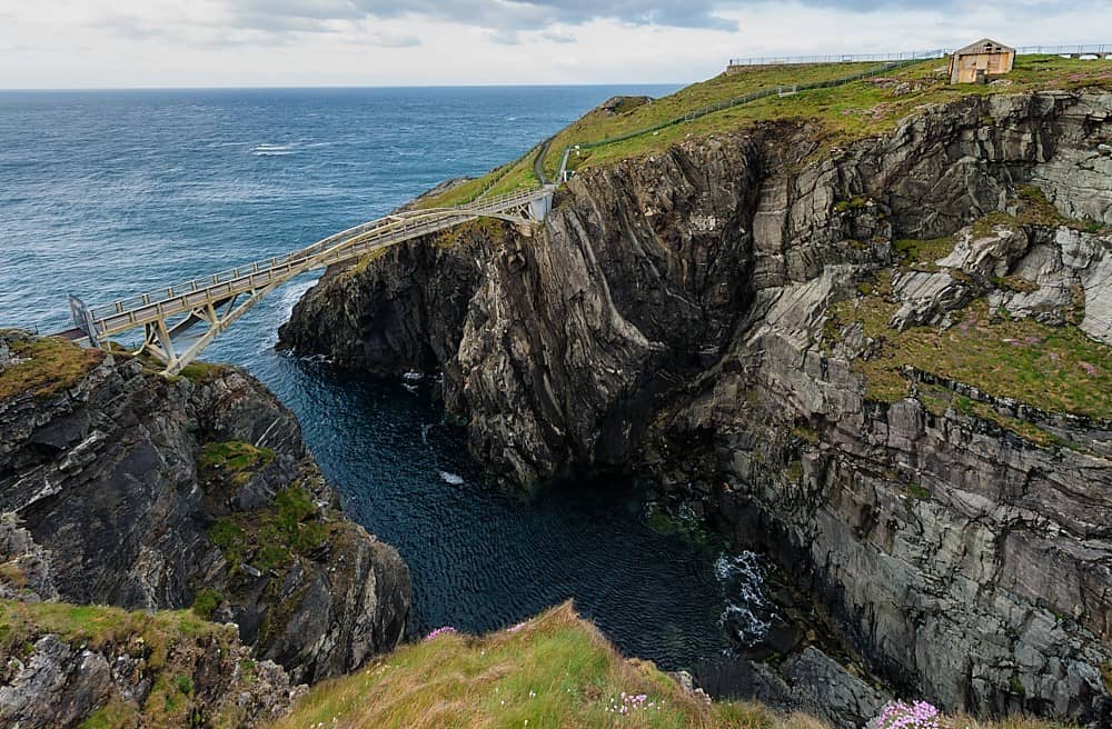 Schroffe Klippen stemmen sich am Mizen Head aus den Fluten des Atlantiks empor und das Echo der Brandung liegt über der Landzunge. An der Westspitze steht ein eher unspektakulärer Leuchtturm, der nur über eine Brücke zu erreichen ist. Dieses 52 Meter lange Bauwerk überspannt einen tiefen Felseinschnitt und führt in schwindelerregender Höhe hinüber zur anderen Seite. Von Mizen Head aus kann auch man am südlichen Horizont den Leuchtturm auf dem Fastnet Rock gut erkennen.